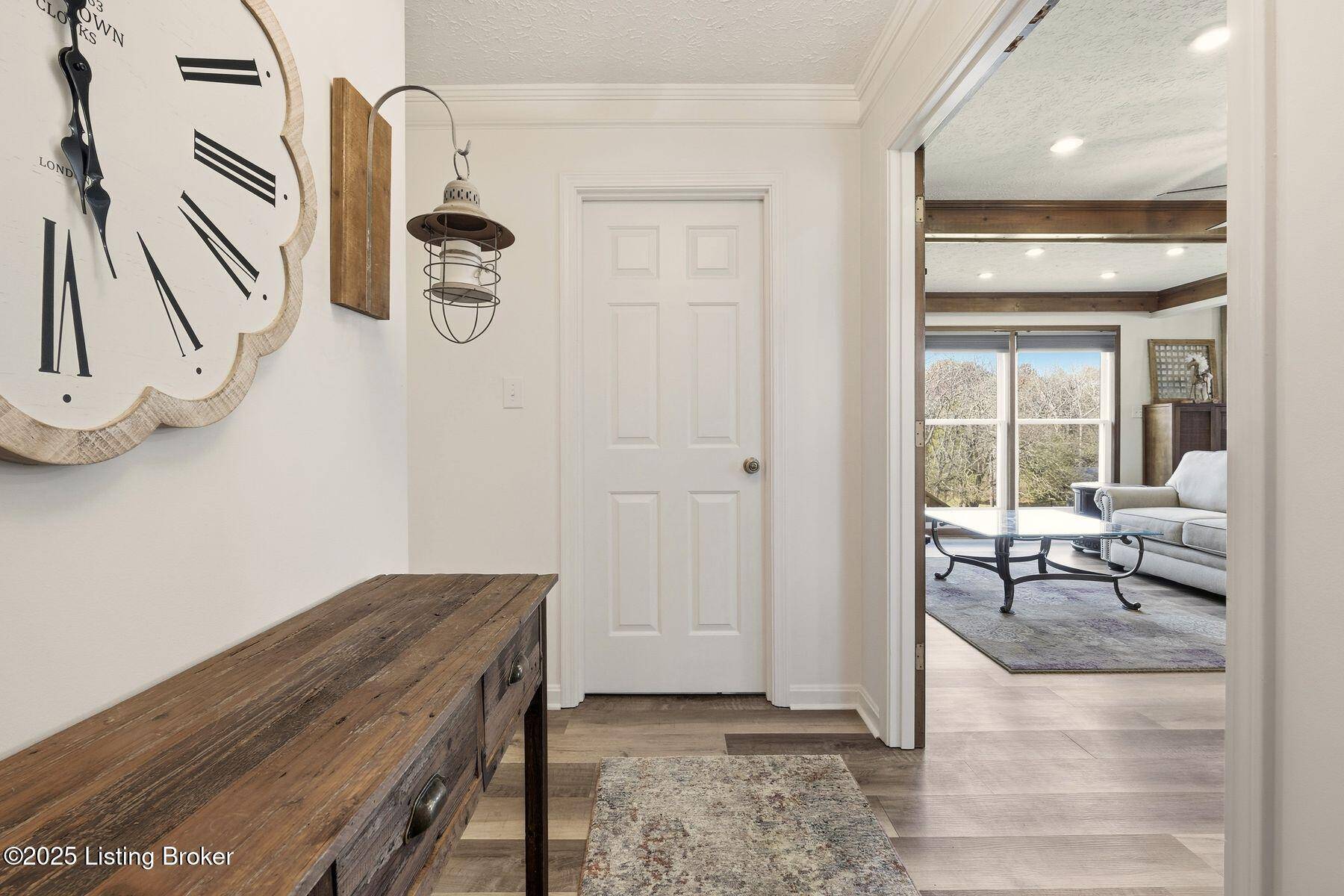 Tucked away on 5 acres in a peaceful, park-like setting in Oldham County, this beautifully updated ranch offers the perfect blend of classic charm and modern comfort. Rolling views and a peaceful creek further back on the property create a truly tranquil backdrop. With over 2,700 square feet, five bedrooms, and two and a half baths, the home also features a newly added 24' x 24' garage with side-mount openers for quieter operation. An open and inviting floor plan showcases updated flooring, a soft neutral palette, and abundant natural light throughout. The gourmet kitchen boasts a large center island, custom cabinetry, new stainless-steel appliances, fine granite countertops, and an induction stove, opening seamlessly to the dining area and living room with a beamed ceiling, cozy fireplace, and access to the expansive new deck overlooking the property's mature trees and scenic views. The primary suite provides a serene retreat with sliding doors to a private deck and a beautifully designed en suite bath featuring a walk-in shower. Two additional bedrooms and a stylishly renovated full bath complete the main level. The recently finished walkout basement expands the home's living space with a generous family room, two bedrooms each offering walk-in closets, durable LVP flooring, and warm lighting. A separate storage and laundry area adds to the home's functionality. Additional updates include dusk-to-dawn exterior soffit lighting, new fixtures throughout, and upgraded storm, sliding, and back doors and windows. Move-in ready and set within one of Oldham County's most scenic areas, this property is a rare find offering space, style, and tranquility all in one.